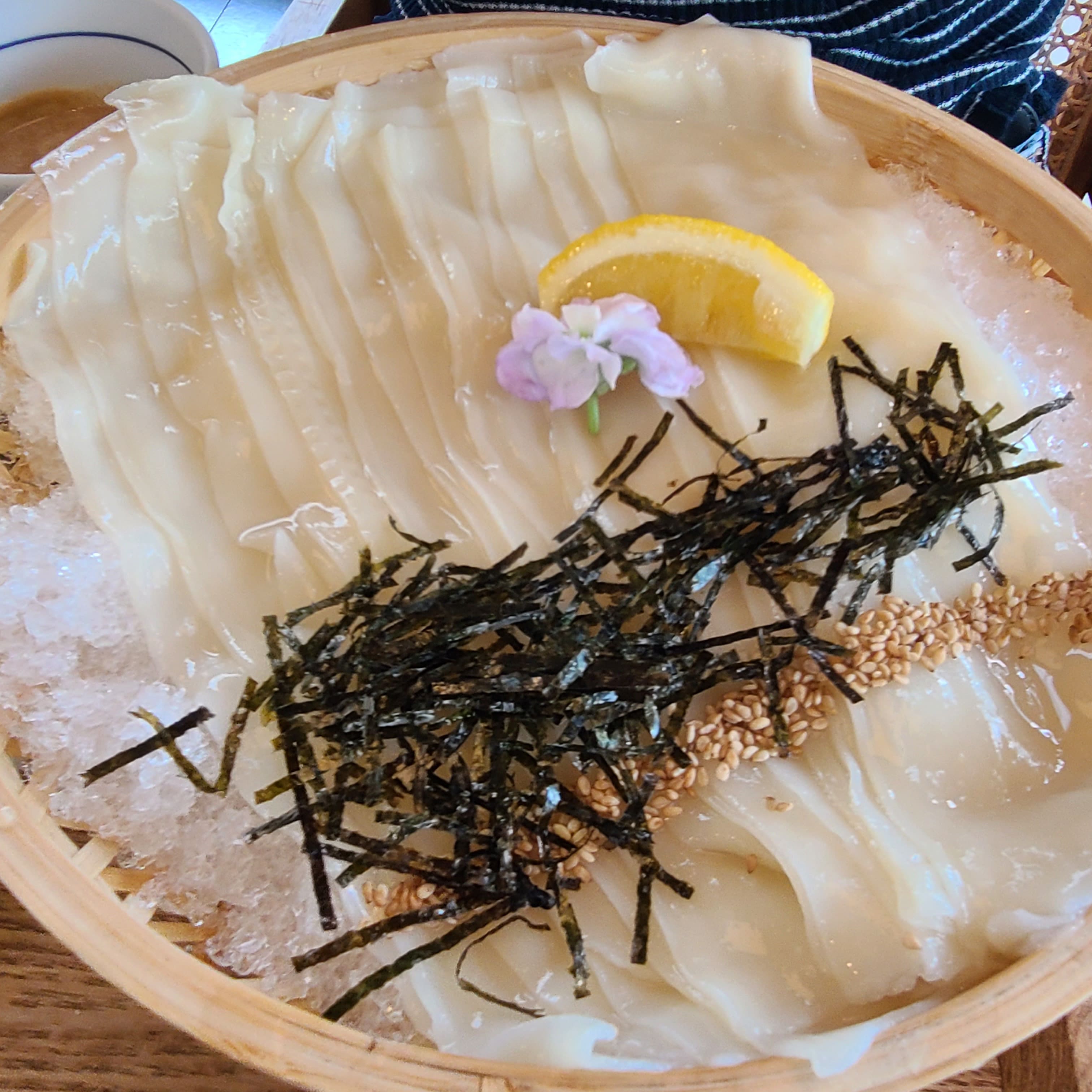 처음엔 그냥 시원한 우동 정도로 생각했는데... 면발이 장난 아니에요. 칼국수처럼 넓적하면서도 쫄깃한 식감이 완전 중독적.