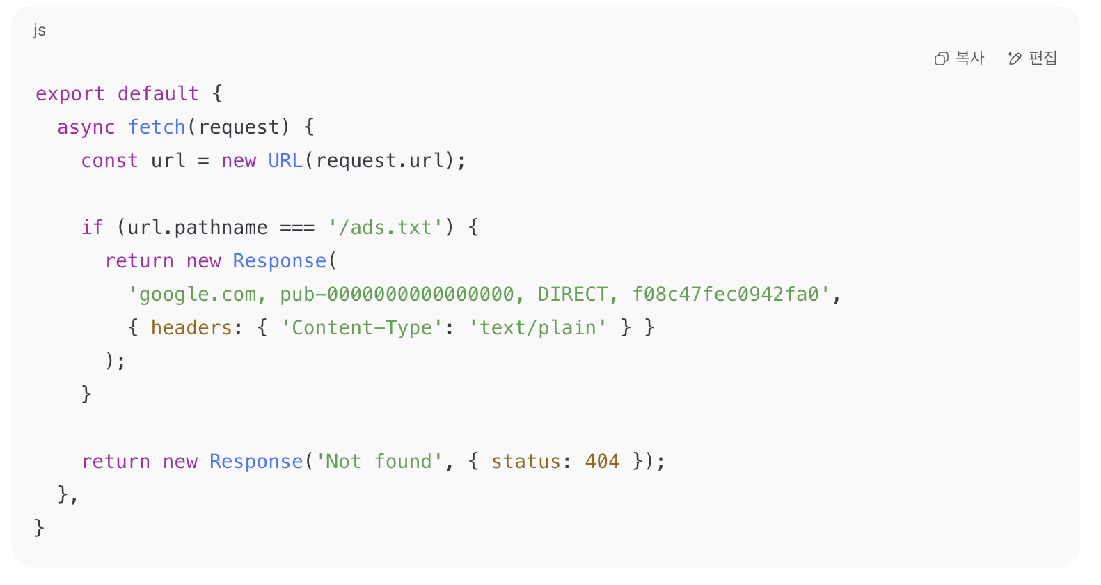그래서 대부분의 독립 도메인 사용자는 Cloudflare Worker를 통해 ads.txt를 노출시킵니다.