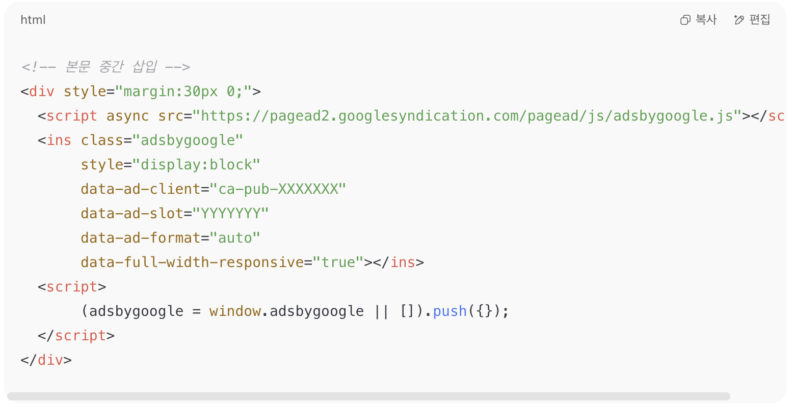 ⚠ ca-pub-XXXXXXX 와 ad-slot=YYYYYYY는 대표님의 애드센스 정보로 바꿔주세요.
